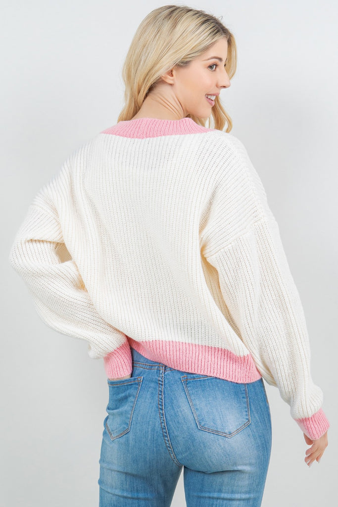 Button down knit cardigan with contrast colour detail. Knit patch strawberry pattern on front and sleeves.