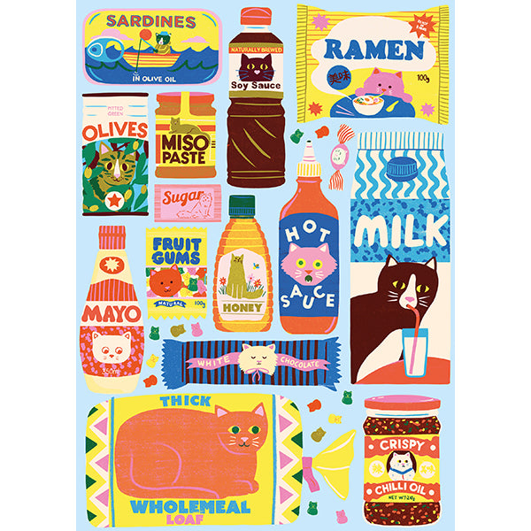1,000 piece jigsaw puzzle featuring illustrated ‘cat food’ by acclaimed illustrator Naomi Wilkinson.