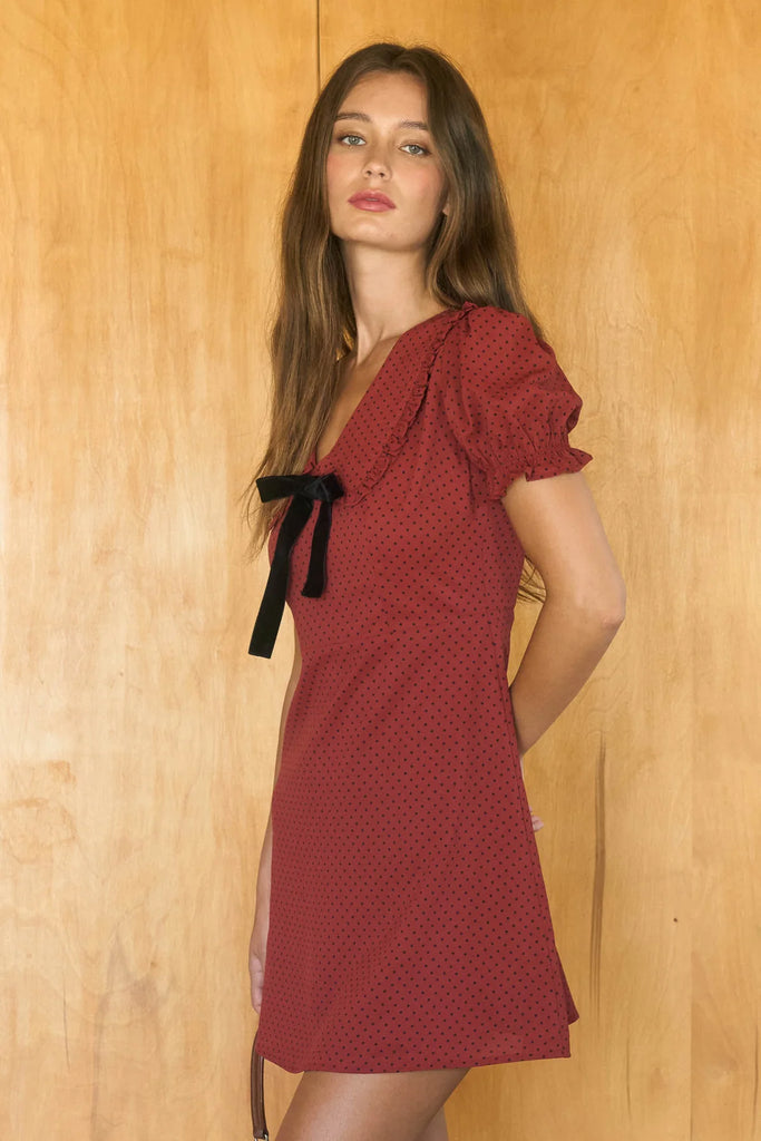 Polka Dot Velvet Tie Mini Dress in Dark Red Combo