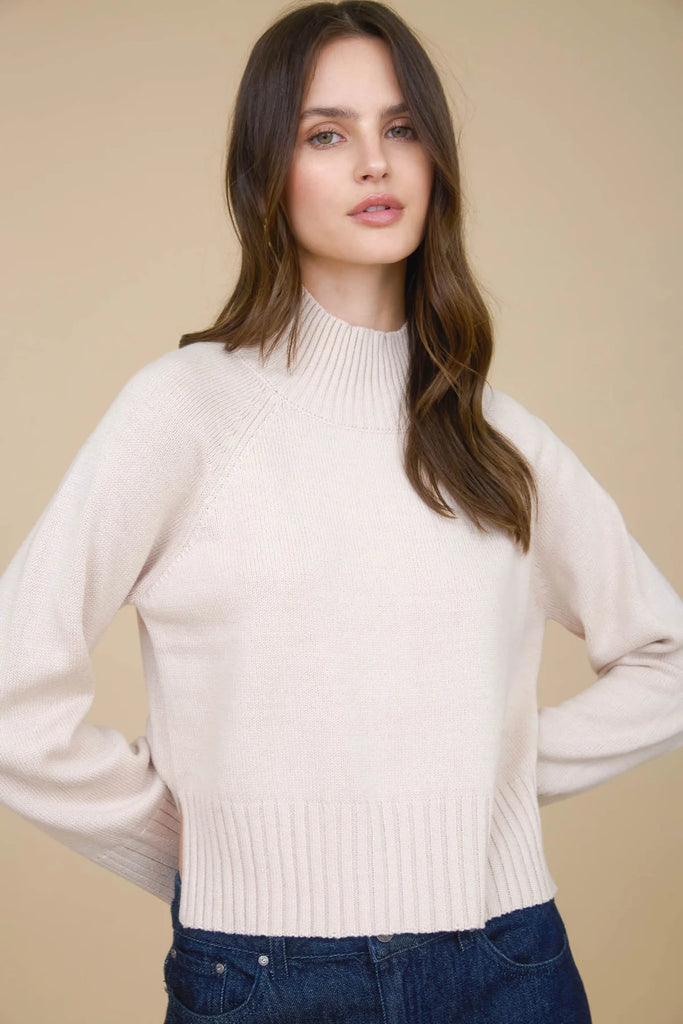 Mock neckline, long sleeve seamless knit sweater. Detailed rib trim. Boxy cropped fit.