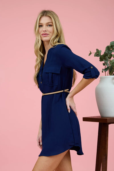 Split neck, button down mini dress. 3/4 folded sleeves. U-hem. Belted. Front pockets.
